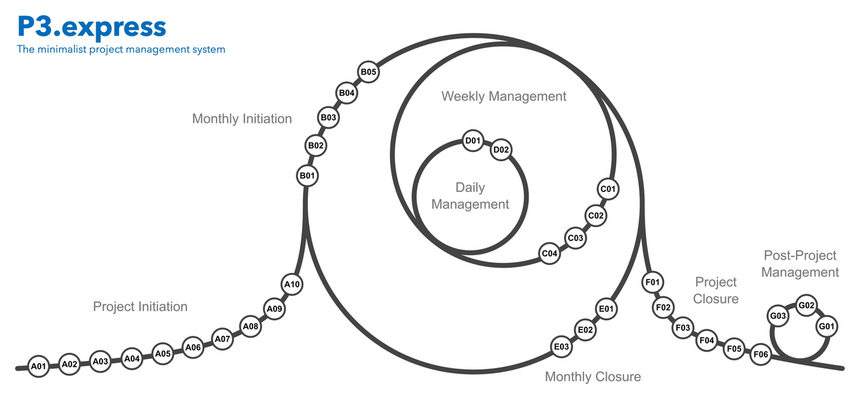 P3.express uses a cyclical system to make the activities simpler and more regular. There are monthly, weekly, and daily cycles, each of which focused on one aspect of managerial activities. Each of the 33 activities has a simple description with a clear purpose and output; those include interesting activities such as peer-reviews and various types of focused communication. In addition to the cycles, there’s a project initiation activity group run at the beginning, and a project closure group at the end.